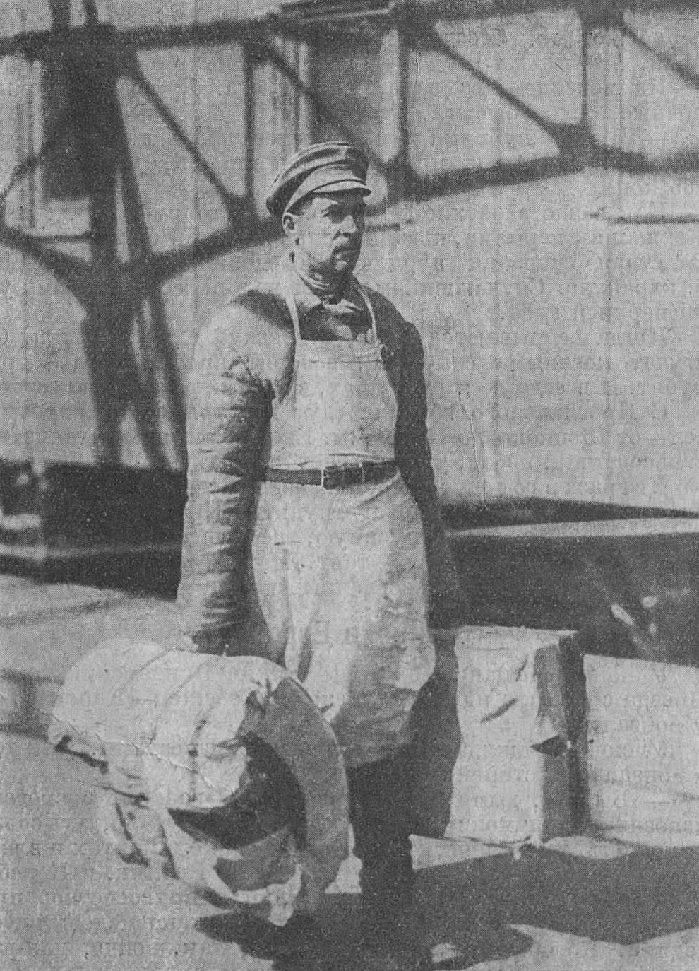 Корзинами пробивают себе дорогу люди с жестяными дощечками на шапках: «Станционный сторож». Артель носильщиков, организованная Учкпрофсожем.