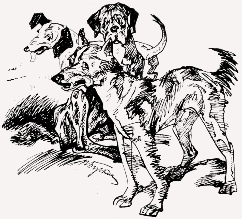 Шарик виновато и пугливо скулит издали; Джим воет, визжит, лает, запертый хозяйкой на своей даче. Только Нерон и Дружок бродят неотступно вокруг дома, где привязана Сэди. Они не смотрят друг на друга, они поочередно подходят к двери, нюхают след, царапают пол балкона и отбегают в сторону, чтобы, подняв к темному густо-зеленому небу оскаленные морды, выть упорно и тяжко.