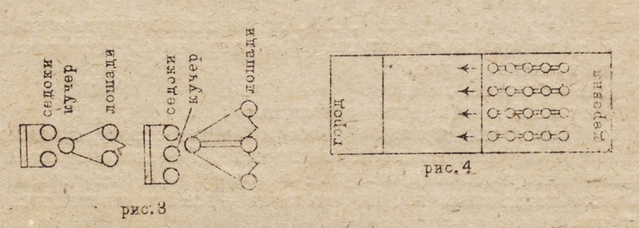 Все ребята выстраиваются в шеренгу в «деревне» и просчитываются на пять номеров. Каждая пятерка — «обоз». Номер первый каждой пятерки становится впереди на черте, а остальные четверо за ним в затылок, и все кладут руки на плечи переднего. Все обозы подравниваются на черте (рис. 4).