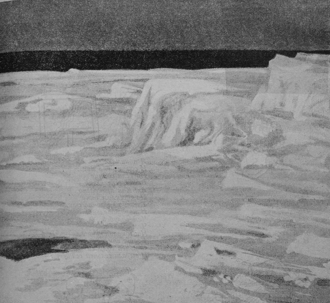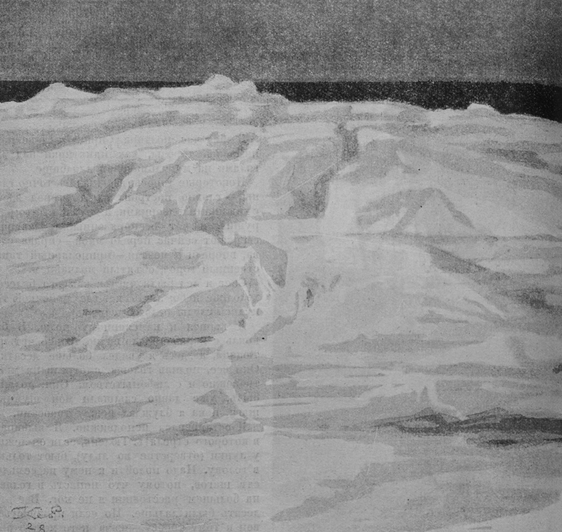 От торосов поползли лиловые тени — значит, наступает ночь. Я поспешно пошел назад, к ледоколу. Черной черточкой он виднелся на горизонте. Идти, идти в белой молчаливой пустыне, идти час, два, — все кругом сверкает и молчит... и тревожит.