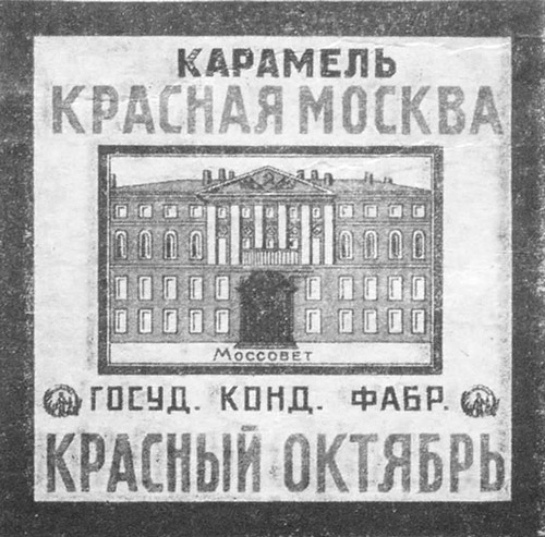 На коробке карамели «Красная Москва» нарисовано здание Моссовета, и напечатаны, стихи: «Нет буржуев, помещиков нет, нами правит наш Совет», а на карамельных бумажках изображены различные примечательные здания Москвы и даны соответствующие стихотворные надписи; на бумажке с изображением здания