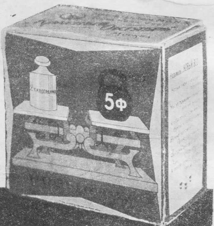 Очень любопытны коробка и обертки карамели «Новый вес» (рис. Маяковского, текст Асеева и. Маяковского), пропагандирующие введенную теперь метрическую систему. На коробке (как предисловие к отдельным текстам карамельных бумажек) стихи о новом весе: